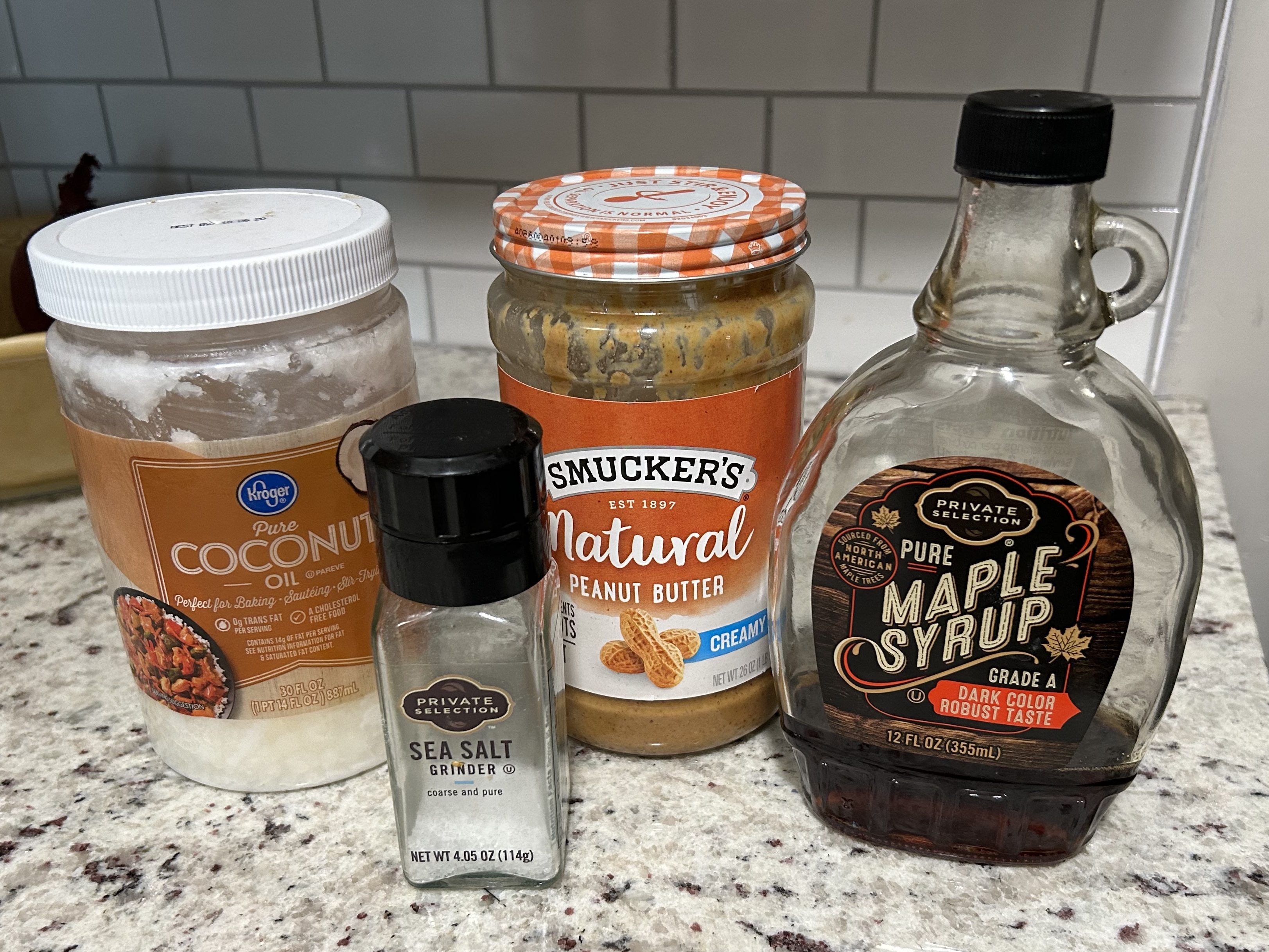 While the chocolate is in the freezer, assemble your peanut butter mixture. In a small bowl, combine the coconut oil, maple syrup, and peanut butter. If the coconut oil isn’t already a liquid-y consistency, you may want to pop it in the microwave for a minute or so to make sure it mixes in well with the other ingredients.