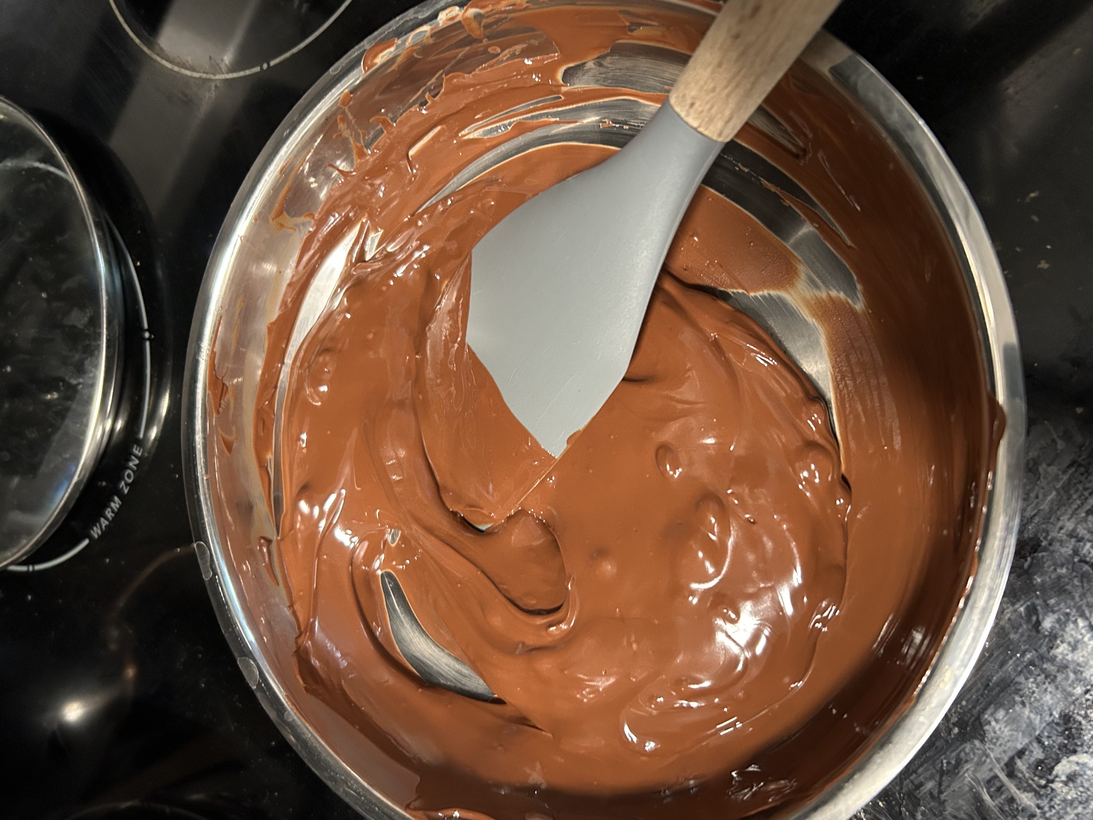 In a small sauce pan, or even a frying pan, melt the chocolate. Make sure to keep the heat on the lowest possible setting and stir very frequently to ensure the chocolate does not burn.