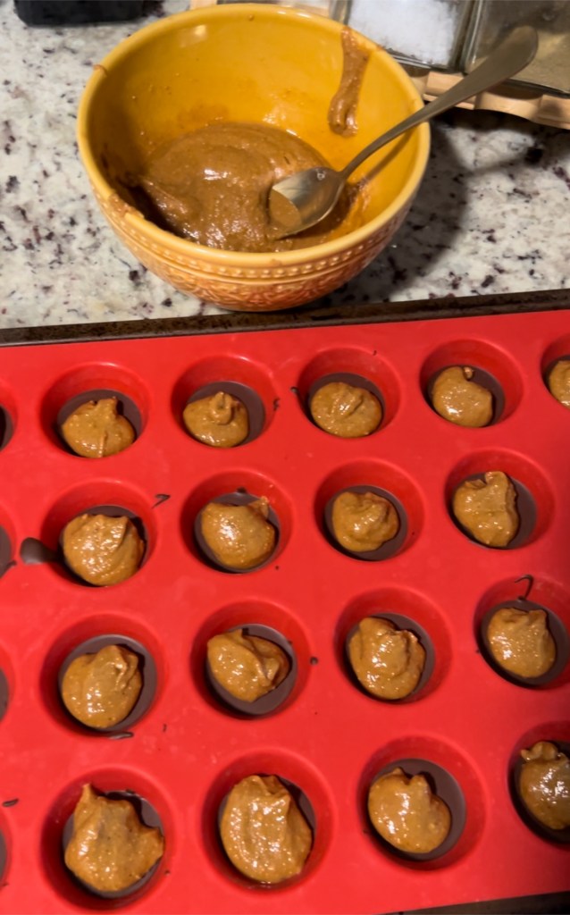In the center of each muffin cup, dollop some of the peanut butter mixture – measure with your heart, or about a teaspoon should do. Try to make sure there is enough space around the outside of your dollop for the chocolate we will pour over top to cover and enclose on the outside. If you’re more concerned with how the finished product will taste than how it will look, you don’t have to worry so much about this step.